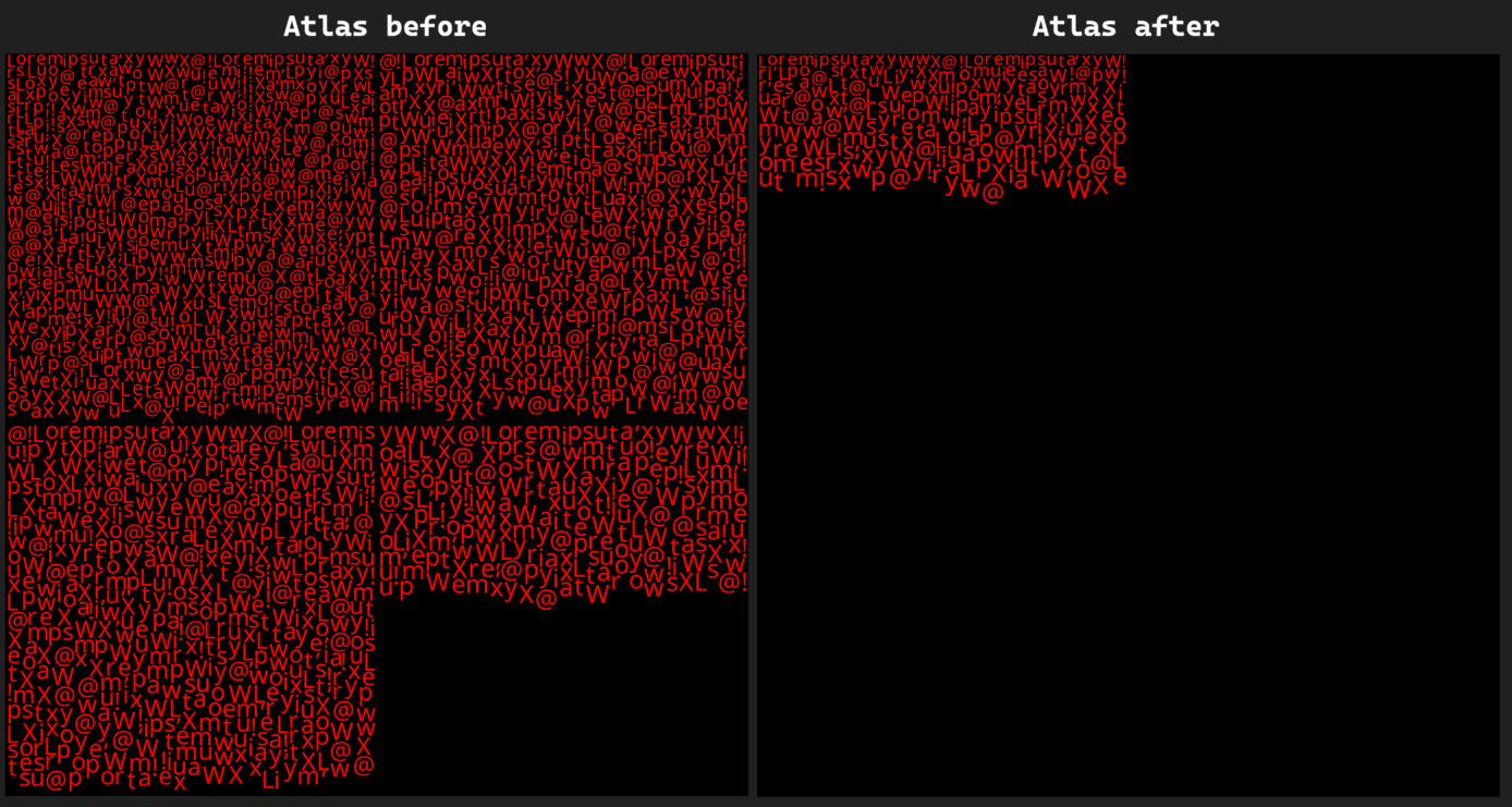 An example of the font atlases generated for the same raster text with all glyphs between 24 and 32 px spaced out by a 0.1f size difference:
